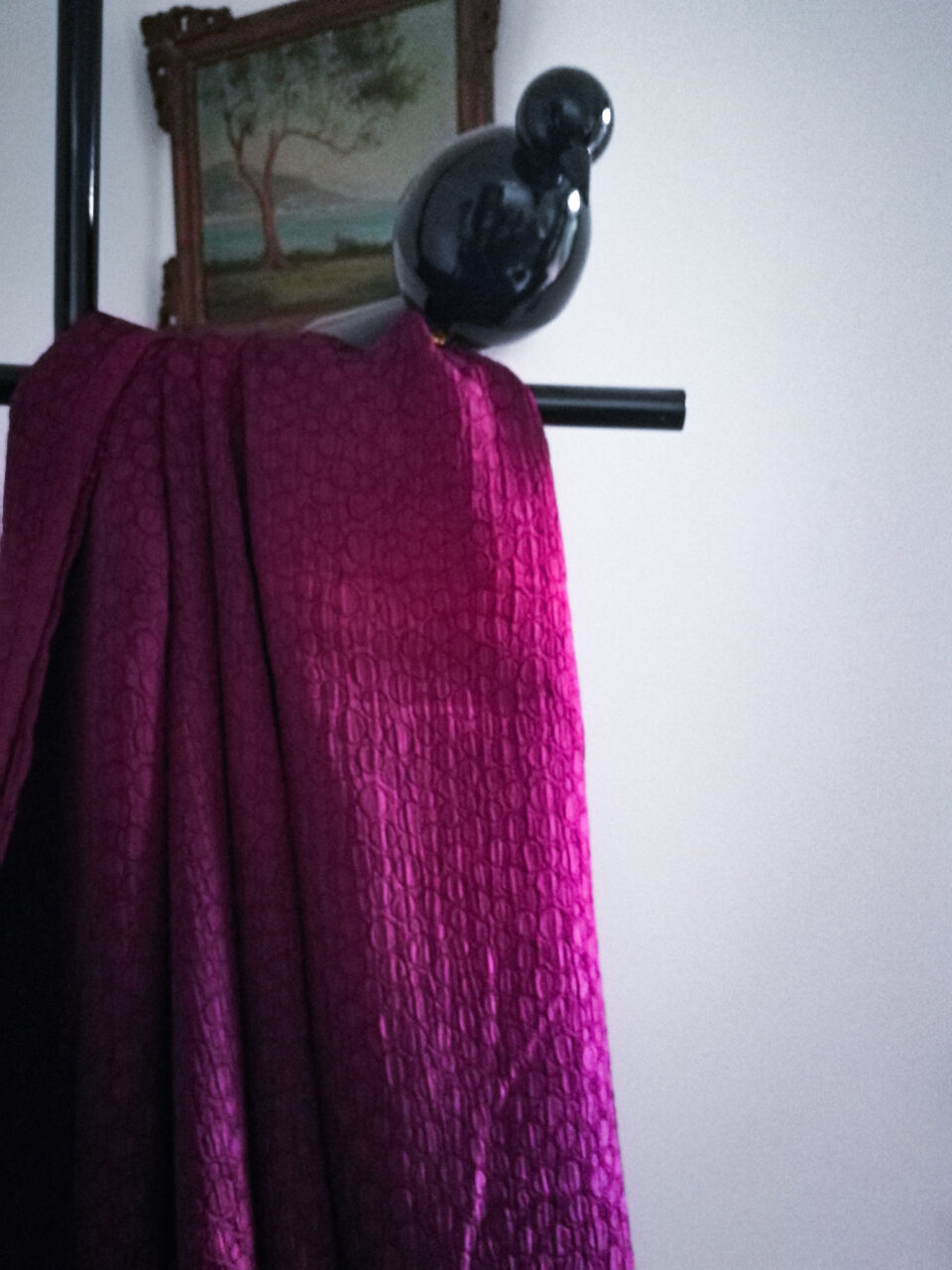 Cette silhouette met parfaitement en valeur ce type de tissu texturé couleur vigne/bordeaux. Elle illustre à merveille ce que l’on peut réaliser avec Berry Eclipse :