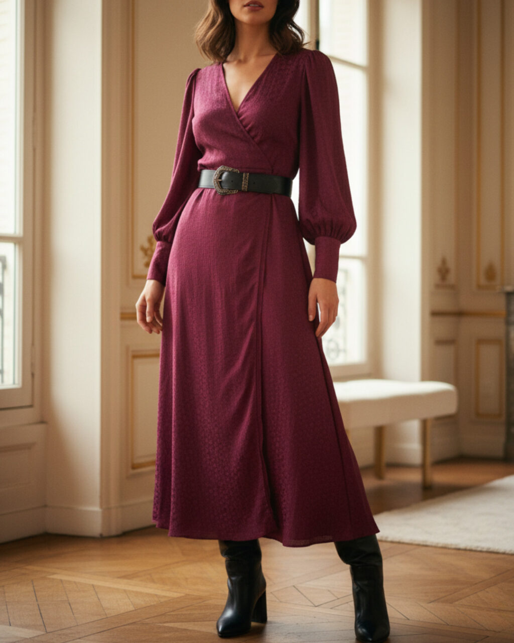 une robe portefeuille fluide et élégante, manches longues légèrement bouffantes, ceinture en cuir noir et bottes hautes pour un look féminin, moderne et ultra-chic.