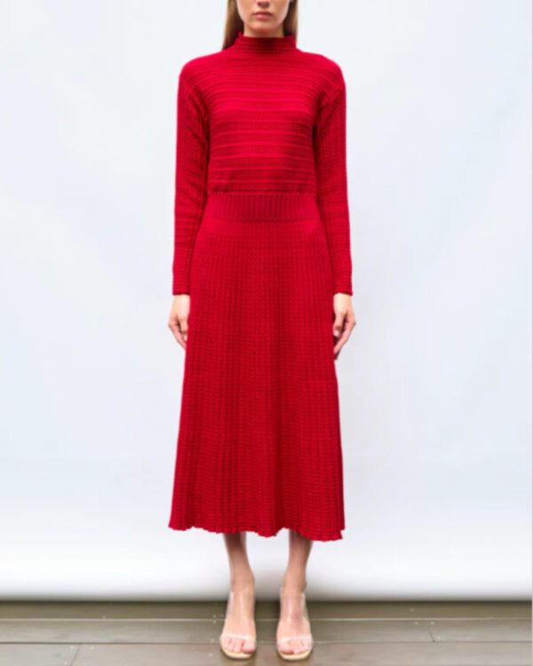 Photo d’inspiration : création Molli — l’élégance intemporelle d’une robe pull côtelée, subtilement structurée, à l’esprit couture et confortable.