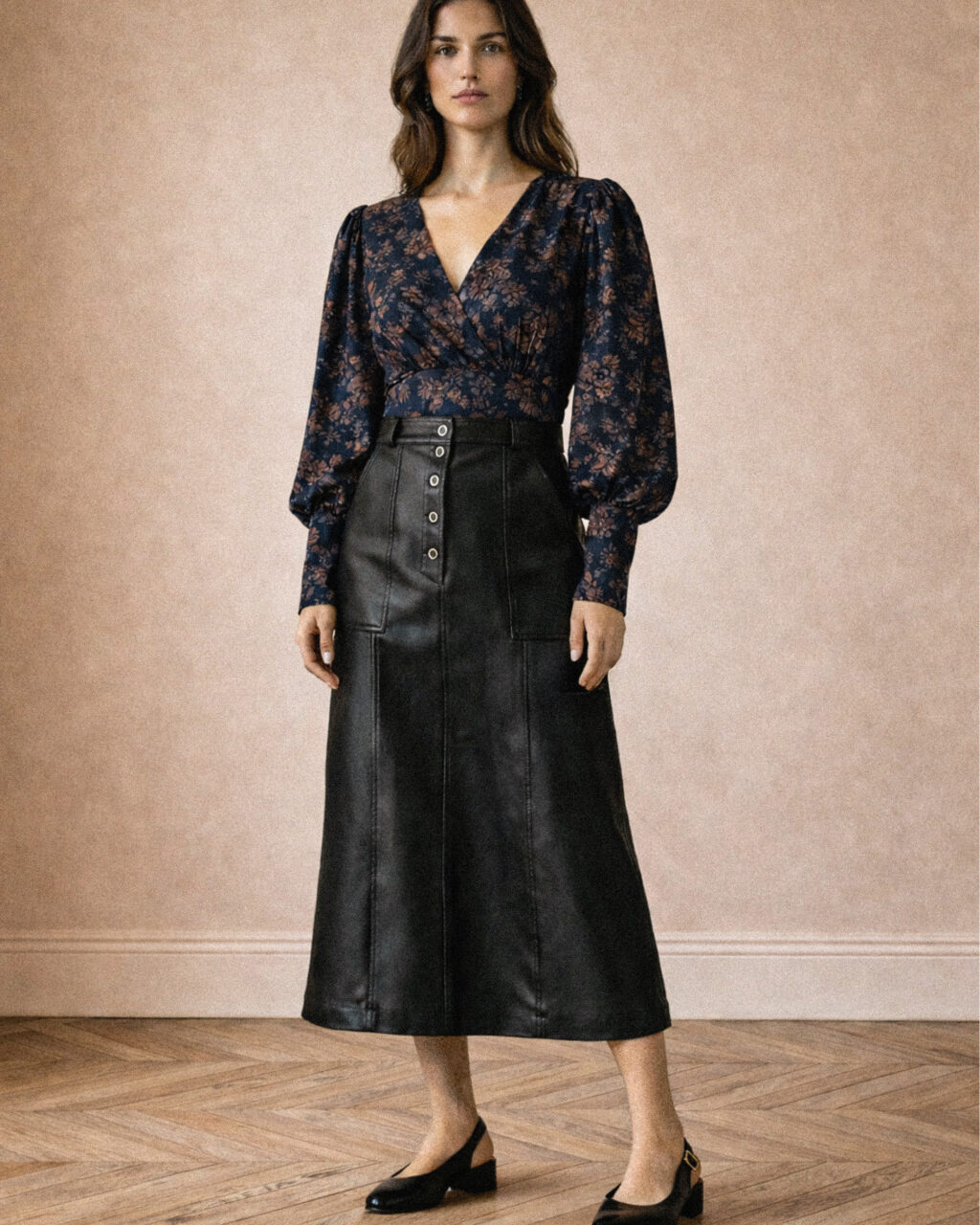 Une jupe midi taille haute à la ligne féminine, accompagnée d’un tutoriel hack pour une version longue et ample esprit “corolle”.