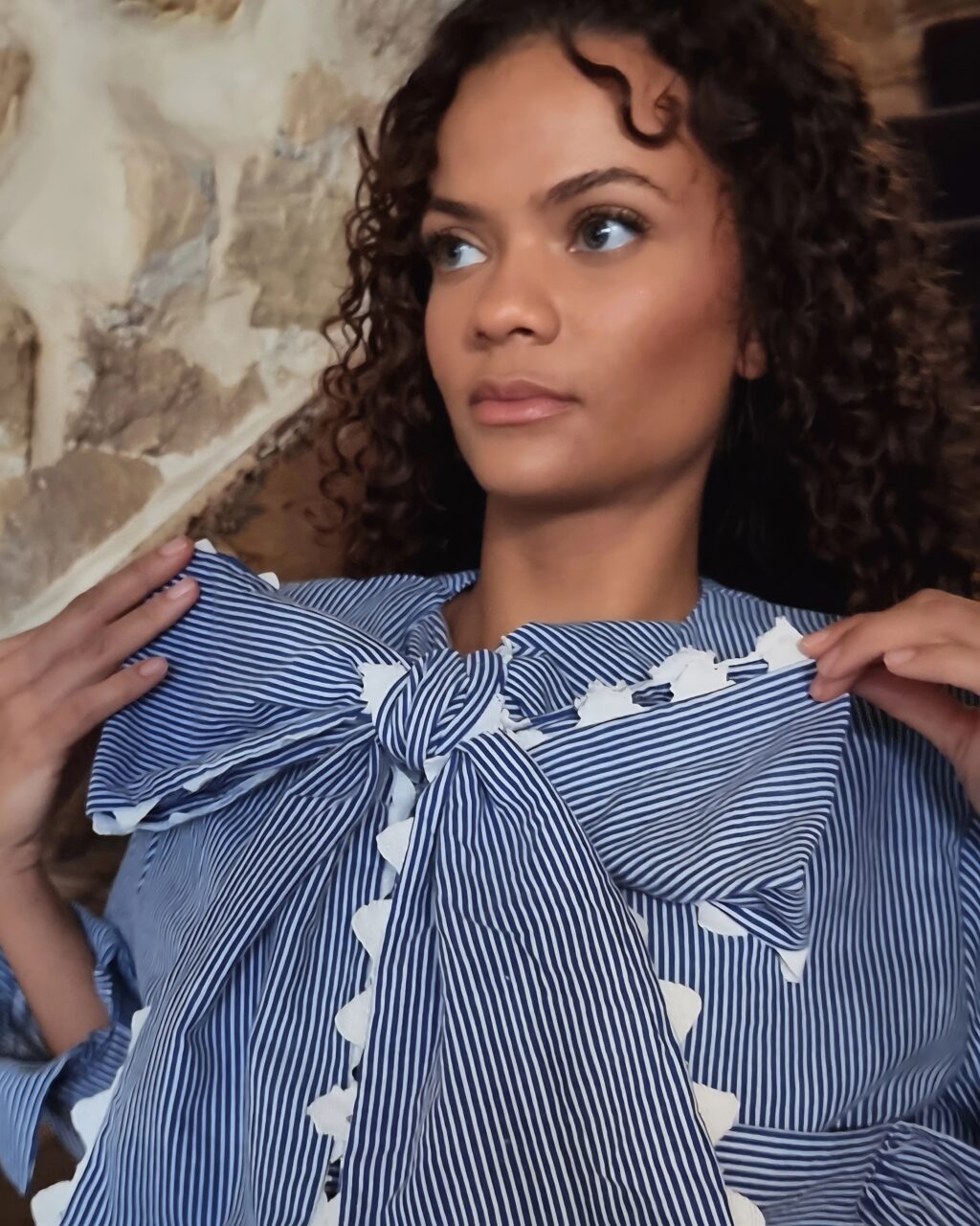 Le Body Romy est un patron de couture PDF permettant de réaliser un body féminin à col lavallière, inspiré du chemisier iconique des années 70.