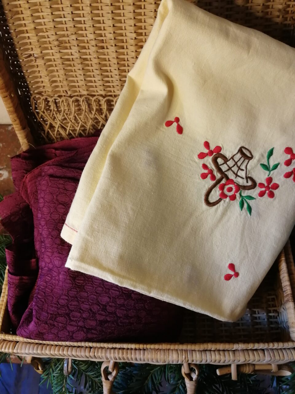 Belle nappe ancienne en coton, avec ourlets d’origine, ornée d’une broderie centrale :